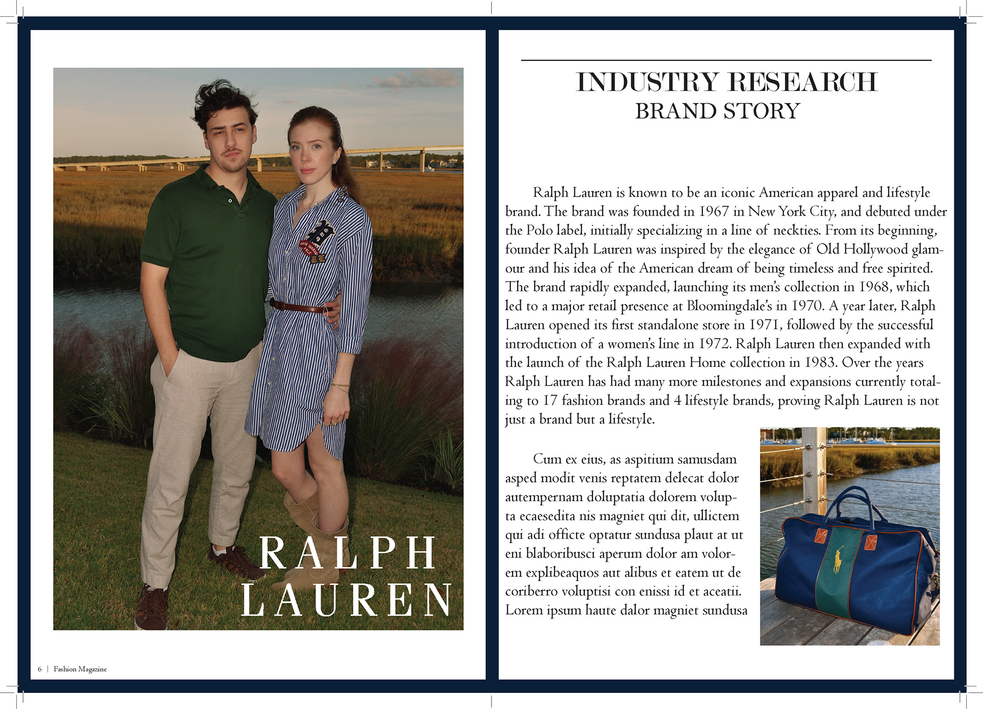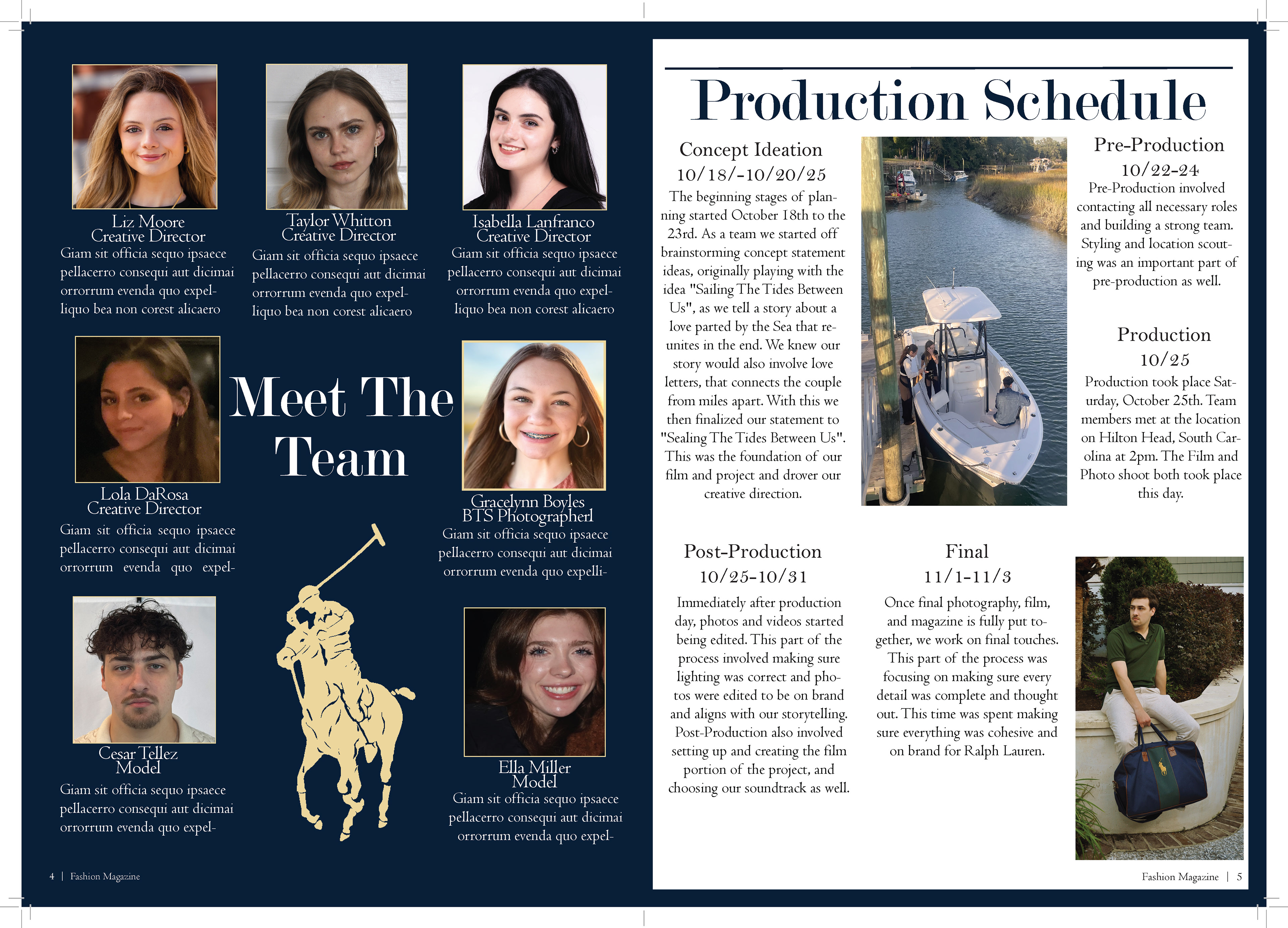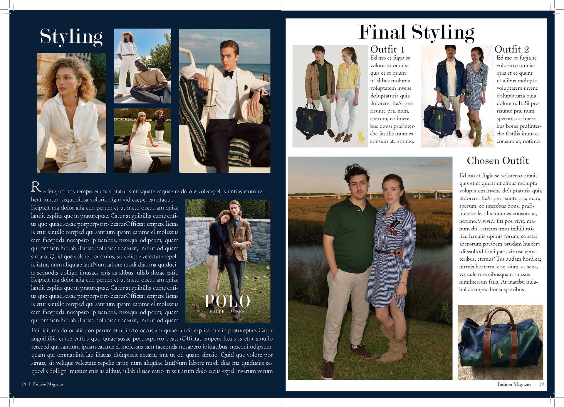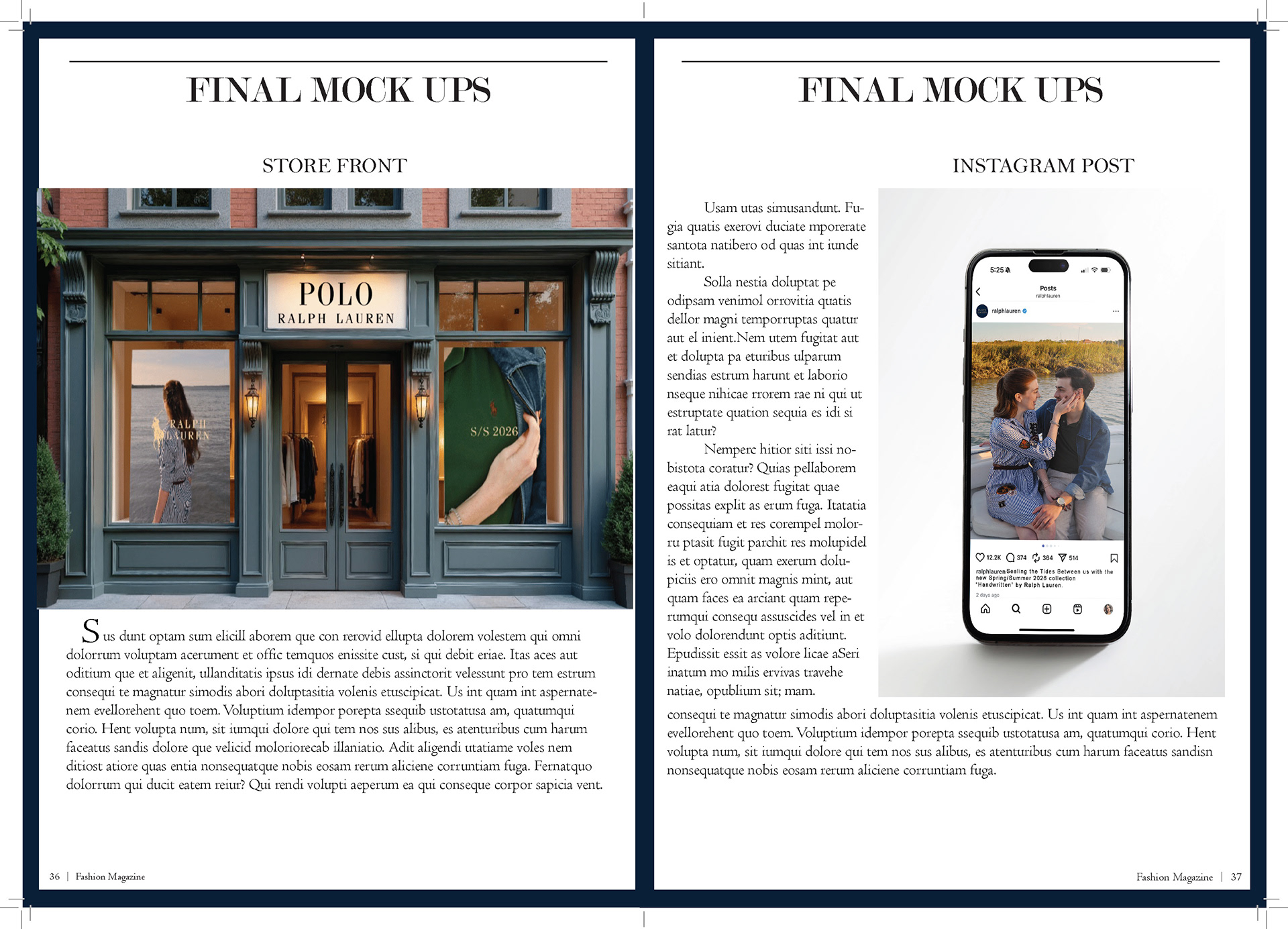 In my Fashion Marketing class, our final project was a mock campaign where we had to work with a team to create a campaign and film for a brand. For this project I was one of the creative directors, the photographer/videographer, and co-stylist. I also helped with creating mockups for advertizing and the editorial spreads.