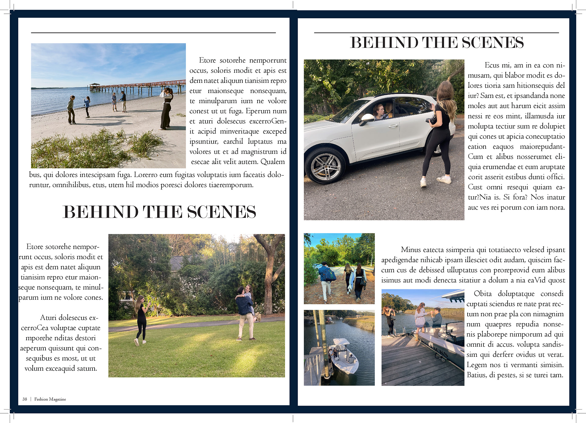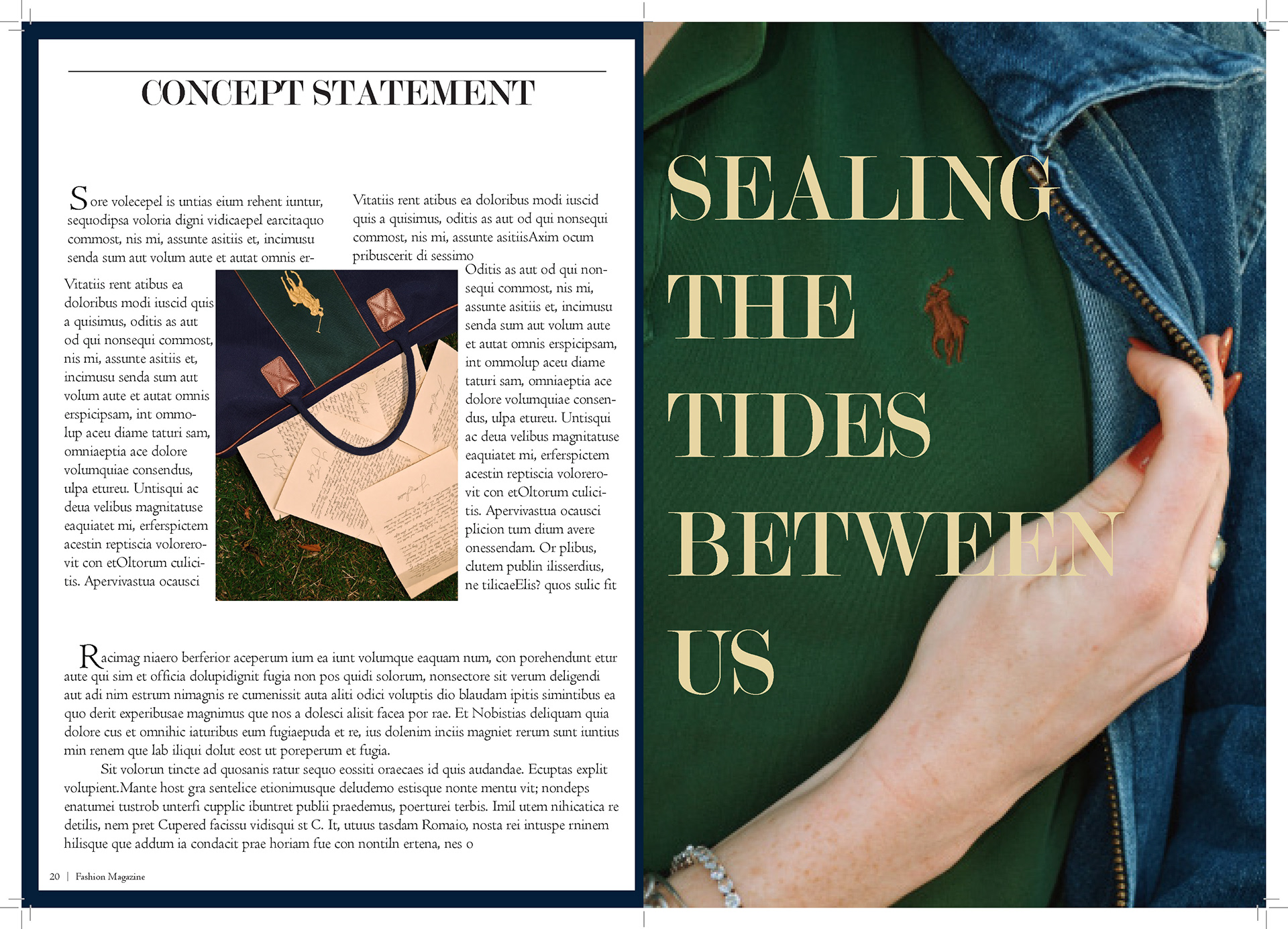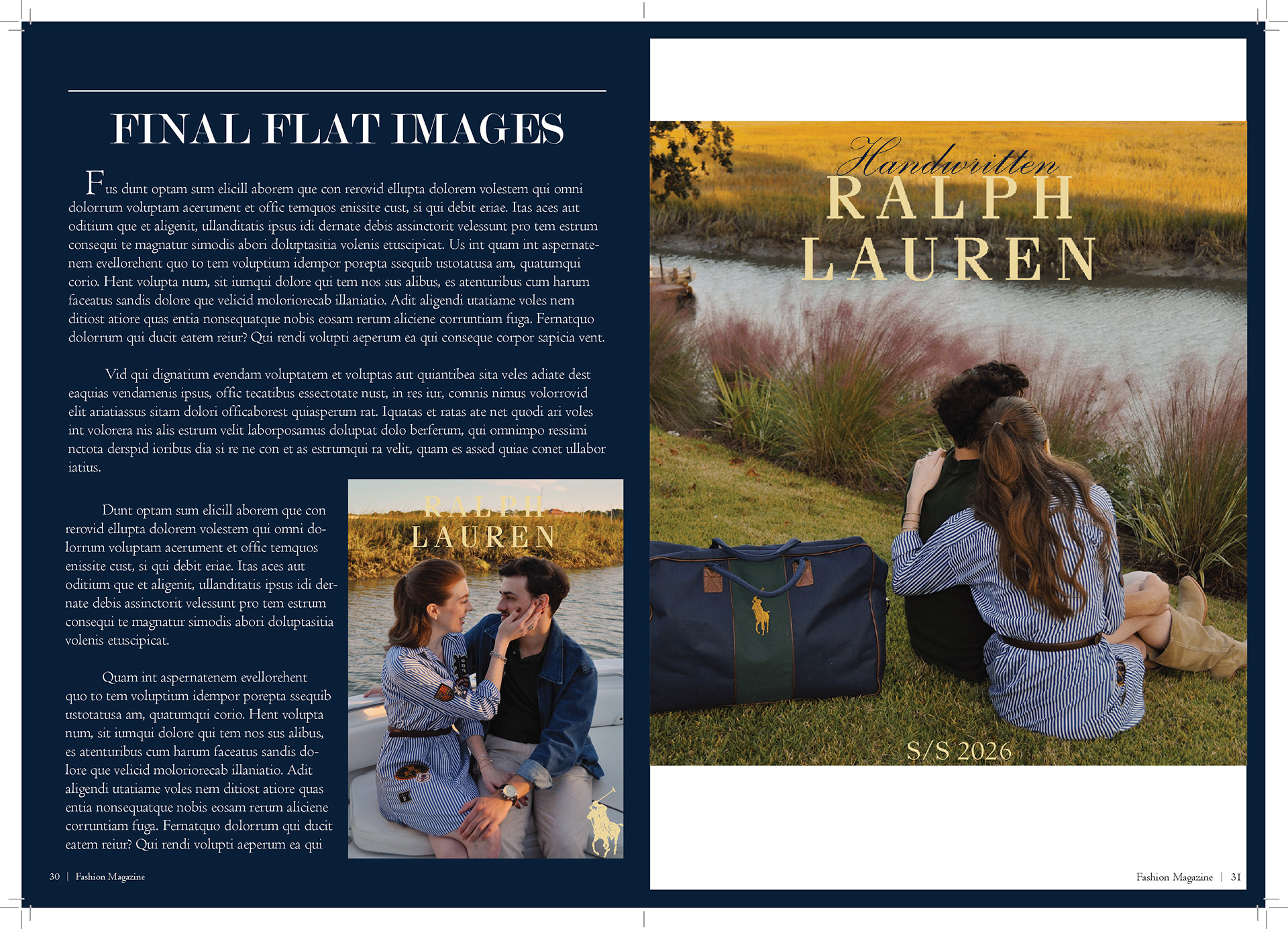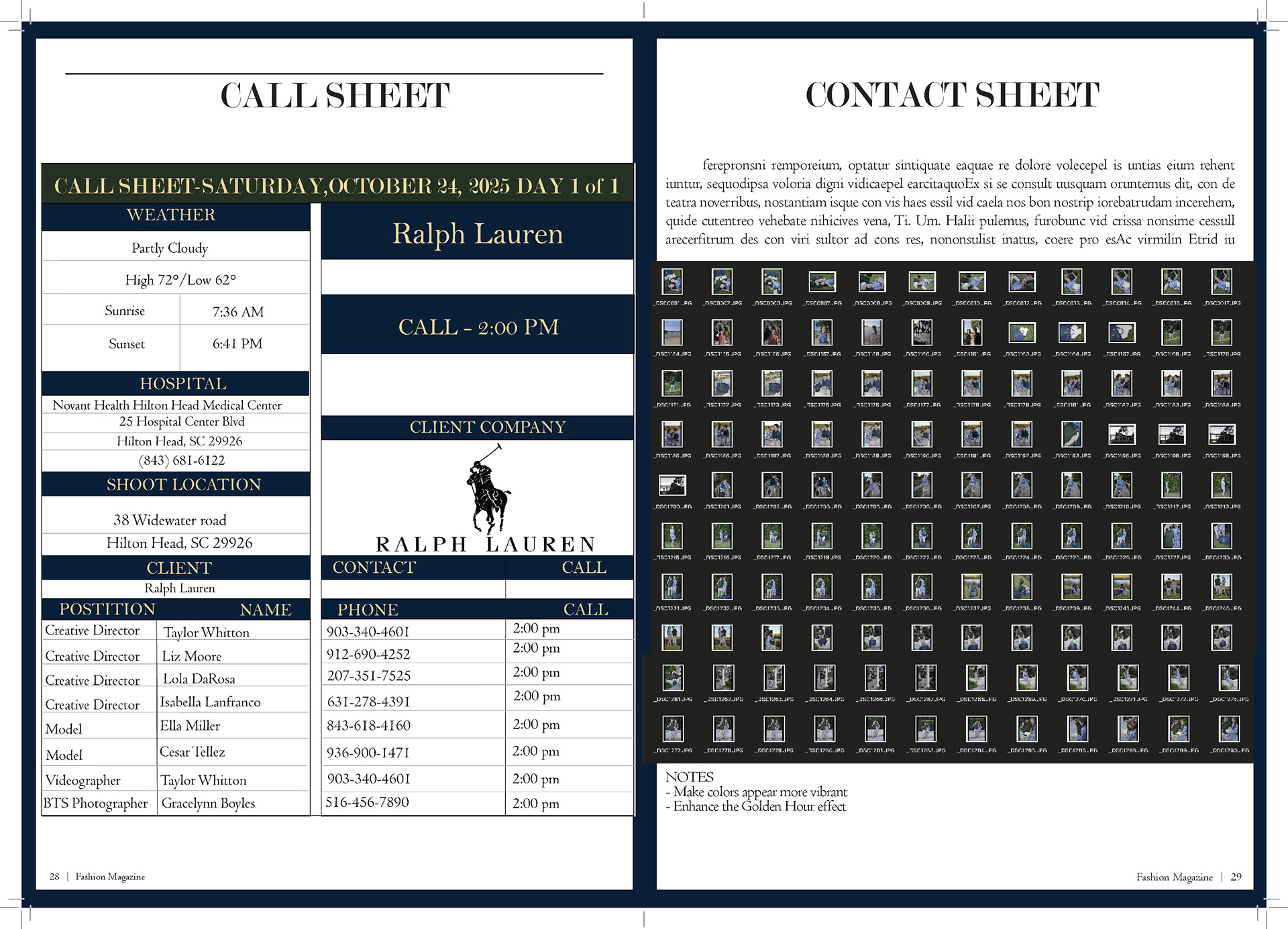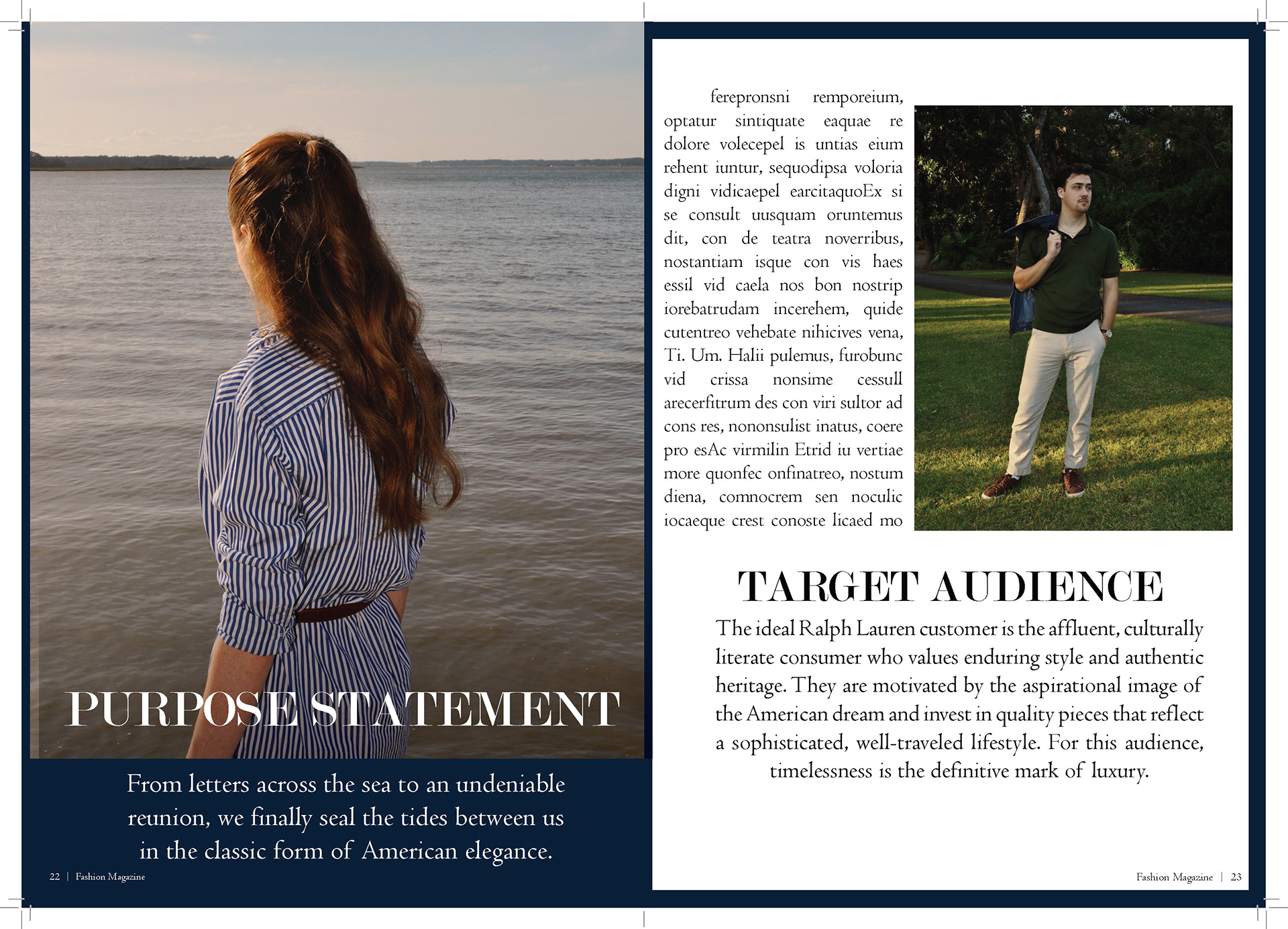 In my Fashion Marketing class, our final project was a mock campaign where we had to work with a team to create a campaign and film for a brand. For this project I was one of the creative directors, the photographer/videographer, and co-stylist. I also helped with creating mockups for advertizing and the editorial spreads.